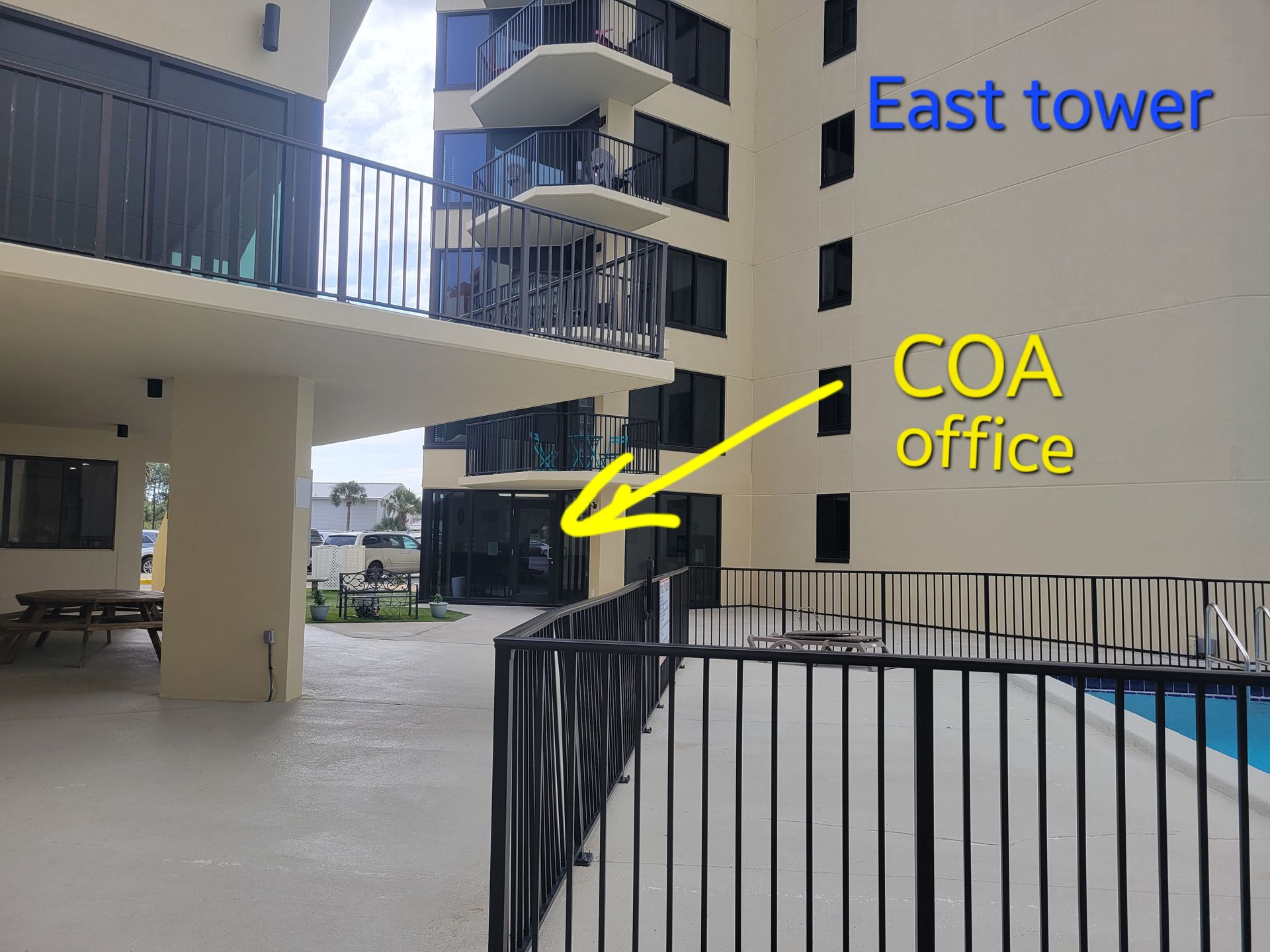 Underneath meeting room building facing center pool,