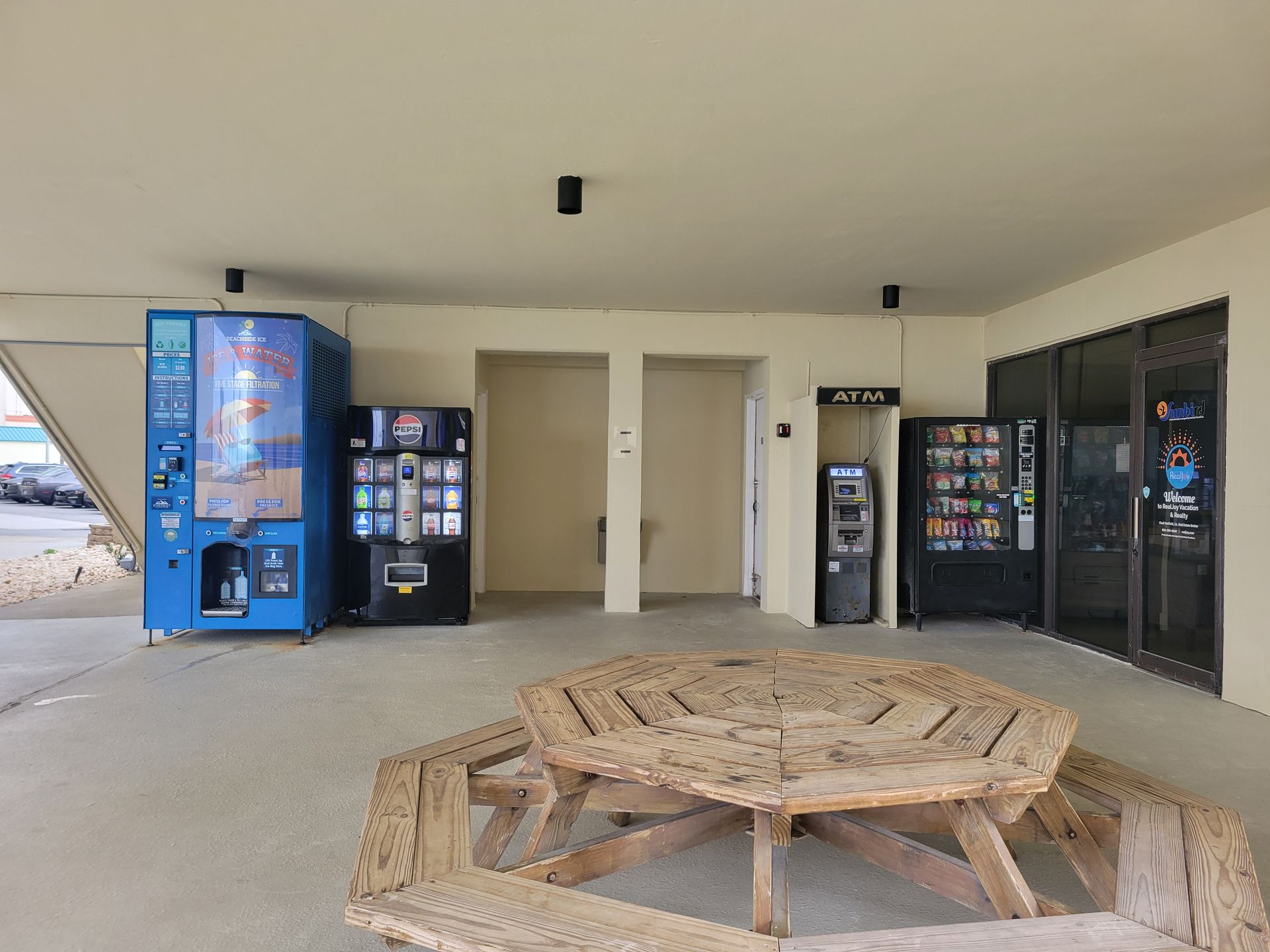 Vending machines for ice, soft drinks, snacks, and ATM: