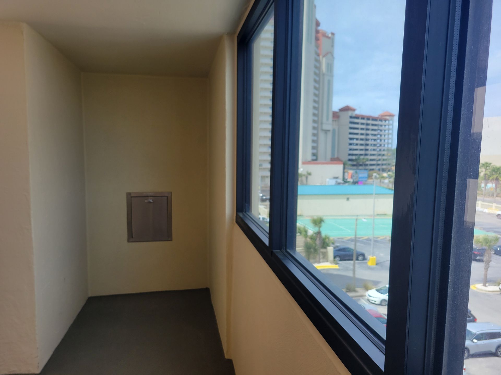 The trash chute is located in front of the elevator that is next to the windows overlooking the parking lot.