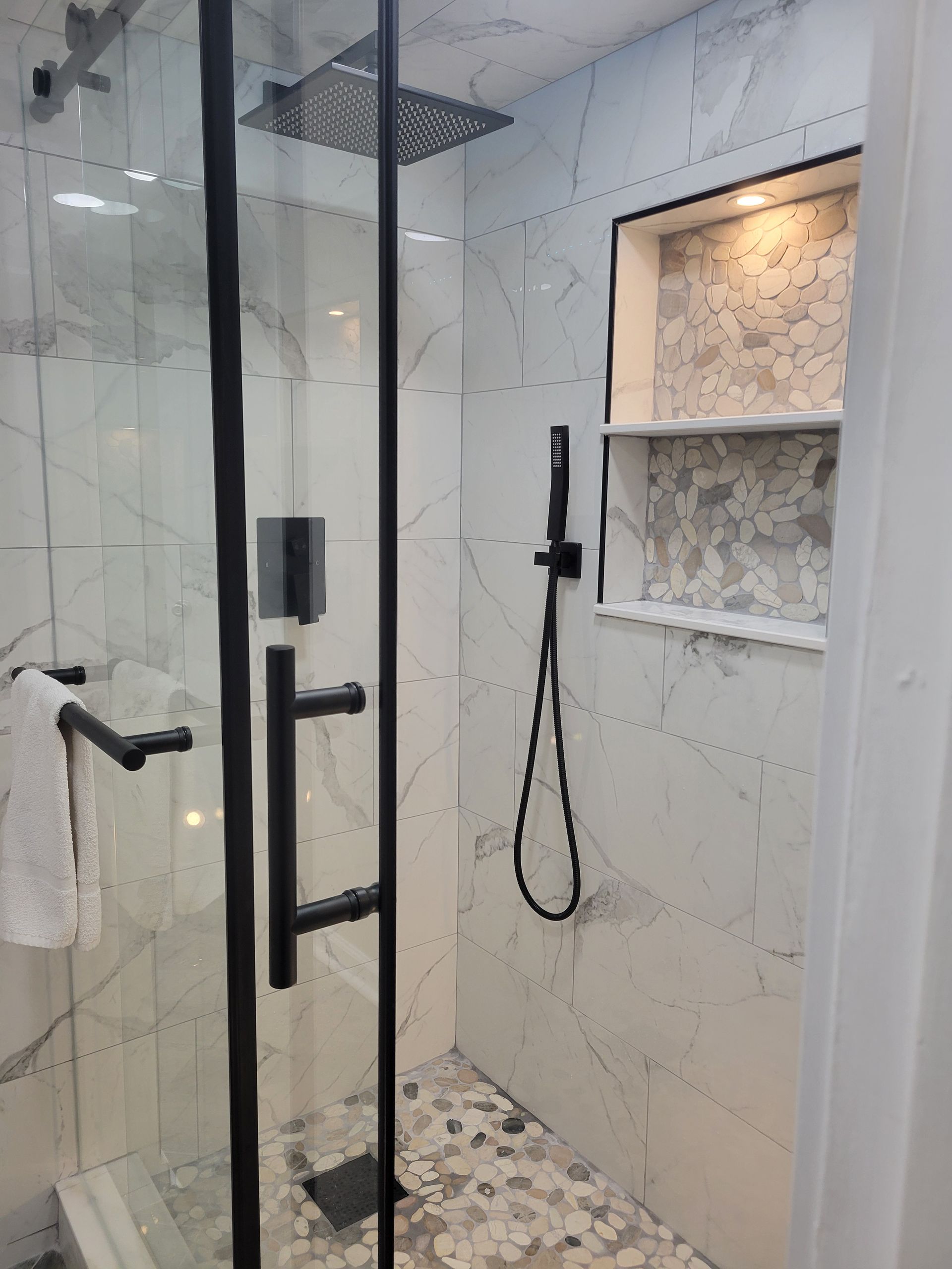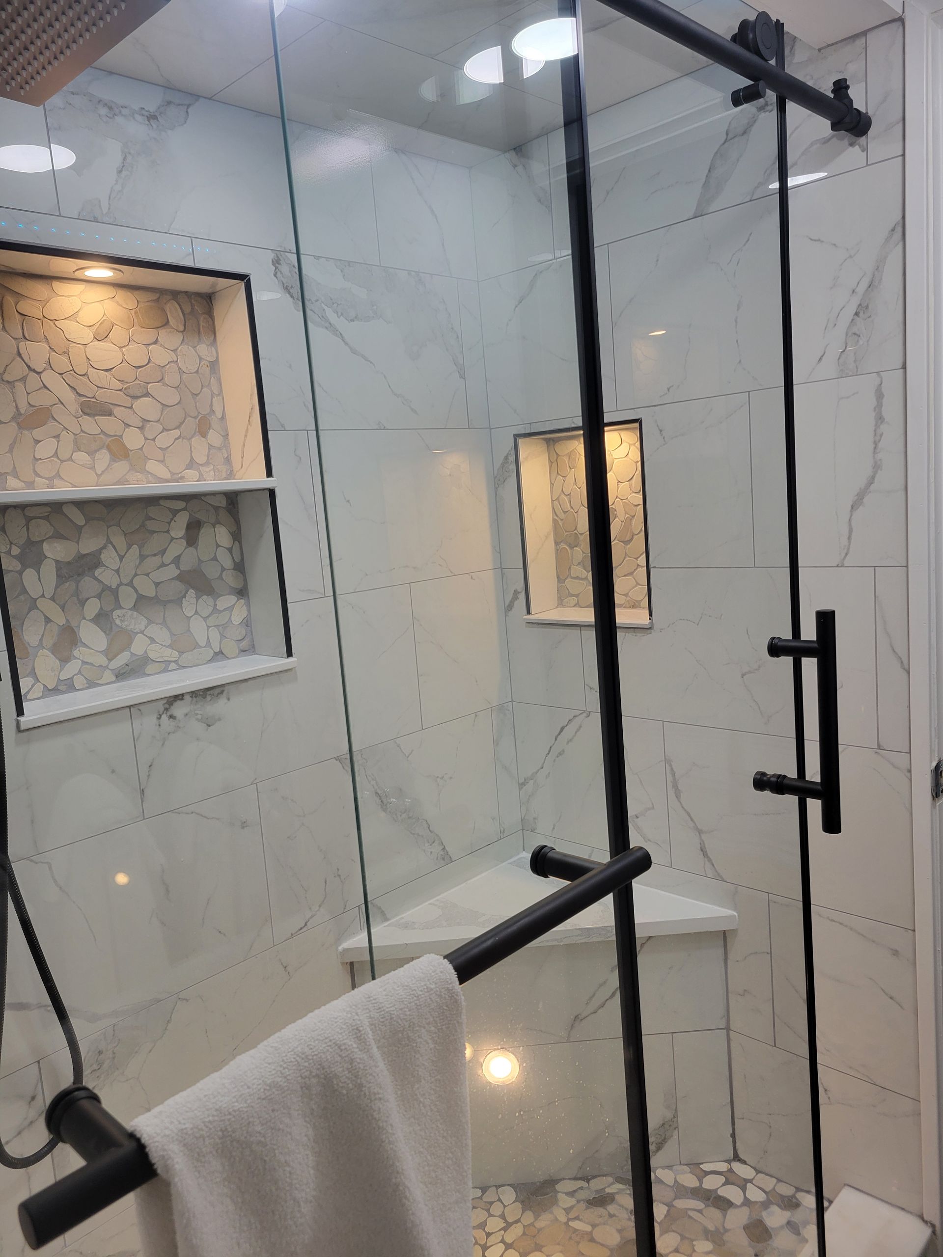The top switch is labeled: Shower overhead, niche, and bench lights. This is the main switch for all 4 lights.