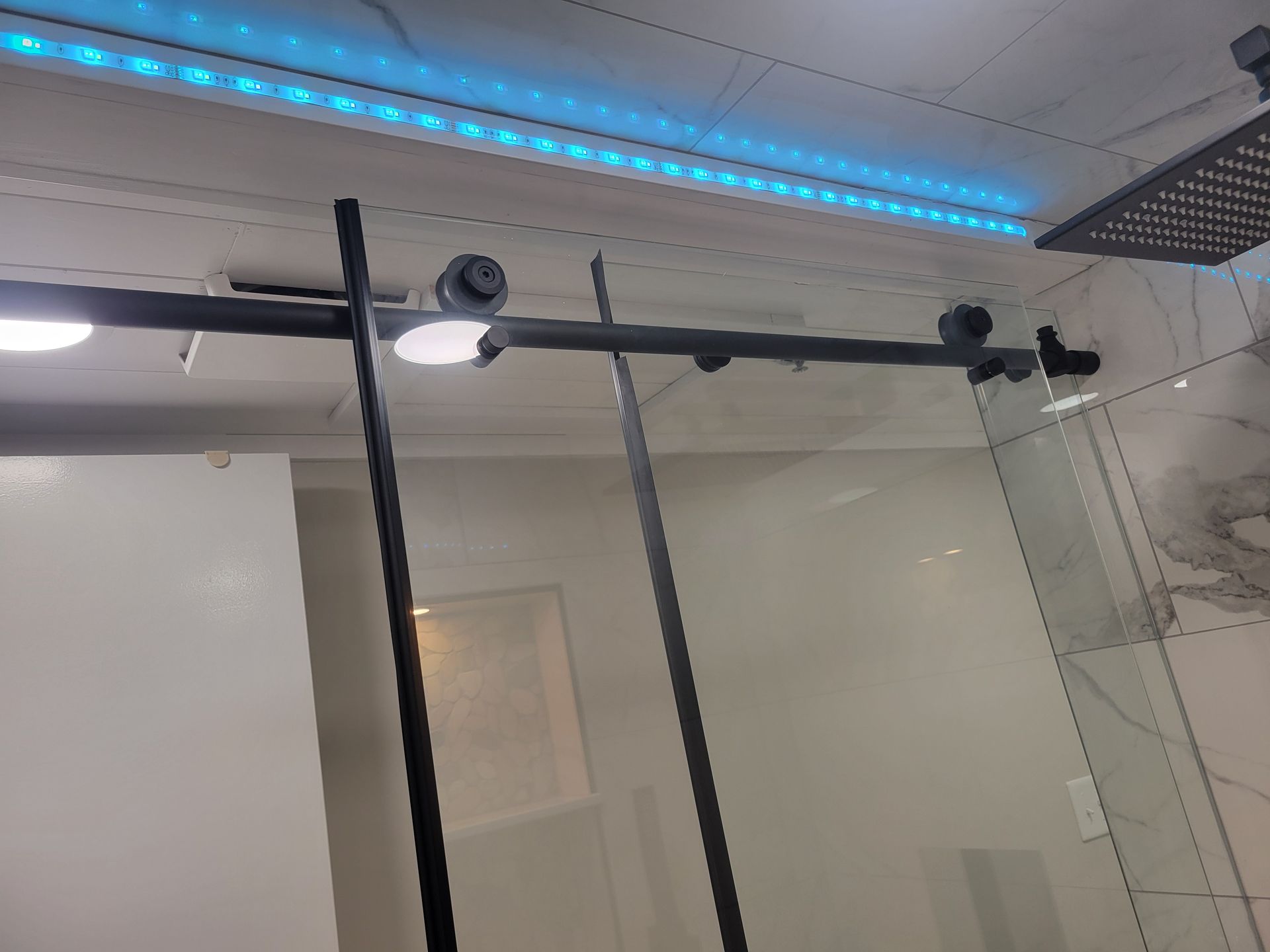 The “rainfall” shower has automatic LEDs that change color depending on water temperature. Blue for cold, Green for in between and Red for hot water.