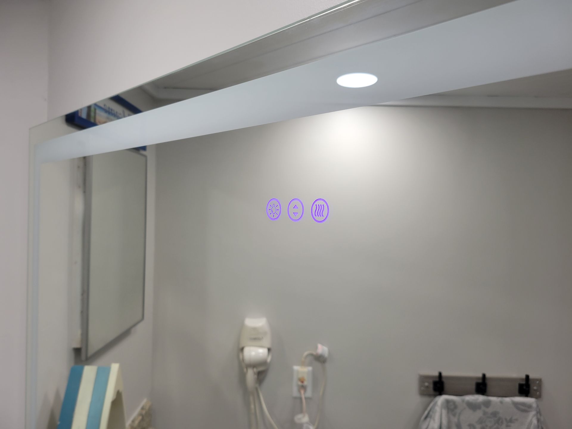 To power the mirror, use the switch (labeled LED mirror light) next to the main entry door.